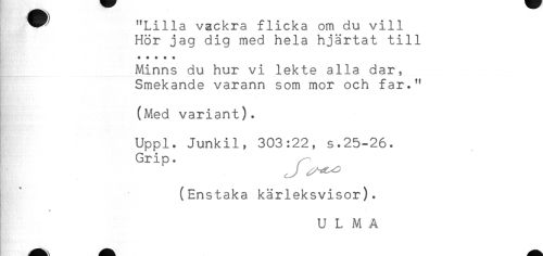 //// ! t) //// ^^ "Lilla vackra flicka om du vill //// Hör jag dig med hela hjärtat till //// ***** //// Minns du hur vi lekte alla dar, //// Smekande varann som mor och far." //// (Med variant). //// Uppl. Junkil, 303:22, s.25-26. //// Grip. ^ //// (Enstaka kärleksvisor). ////
