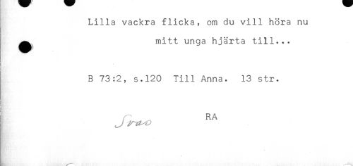 //// Lilla vackra flicka, om du vill höra nu //// ^ mitt unga hjärta till... //// B 73:2, s.120 Till Anna. 13 str. //// RA ////