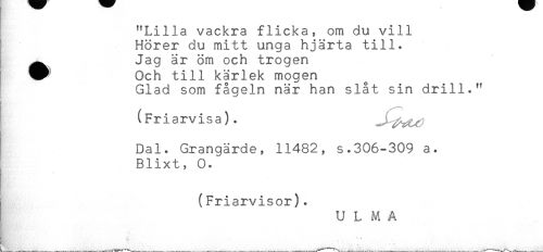//// "Lilla vackra flicka, om du vill //// Hörer du mitt unga hjärta till. //// ^ Jag är öm och trogen //// Och till kärlek mogen //// Glad som fågeln när han slåt sin drill." //// (Friarvisa). //// Dal. Grangärde, 11482, s.306-309 a. //// Blixt, O. //// (Friarvisor). ////