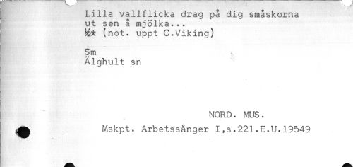 //// Lilla vallflicka drag på dig småskorna //// ut sen å mjölka... //// (not. uppt C.Viking) //// Sm //// Älghult sn //// NORD. MUS. //// ^ Mskpt. Arbetssånger I,s.221.E.U.19549 ////