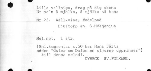 //// ^^ Lilla vallpiga, drag på dig skona //// Ut se'n å mjölka, å mjölka så kona //// - //// Nr 23. Wall-visa, Medelpad //// Ljustorp sn. S.HVagenius //// < //// Mel.not. 1 str. //// (Enl.kommentar s.50 har Hans Järta //// oniden "Öster om Dalom en stjerne upprinner") //// till denna melodi. ////