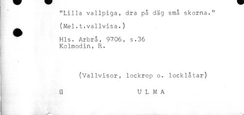 //// "Lilla vallpiga, dra på däg små skorna." //// ! //// i (Mel.t.vallvisa.) //// H K) //// Hls. Arbrå, 9706, s.36 //// Kolmodin, R. //// B //// 1 //// i (Vallvisor, lockrop o. locklåtar) //// * //// u ULMA ////