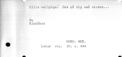 //// Lilla vallpiga' Dra på dig små skorna... //// mt * //// Hs //// Bjuråker //// *** //// NORD. MUS. //// Lekar etc. IV. s. 444 ////
