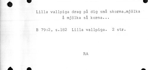 //// Lilla vallpiga drag på dig små skorna,mjölka //// å mjölka så korna... //// * //// B 79:2, s.182 Lilla vallpiga. 2 str. //// RA ////