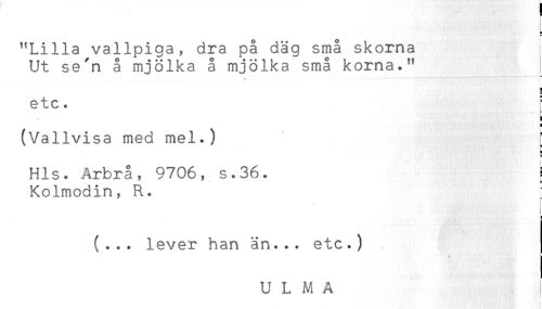 //// < //// * //// L- //// "Lilla vallpiga, dra på däg små skorna //// Ut se'n å mjölka å mjölka små korna." //// t. //// H //// etc. [ //// t //// ä //// H //// (Vallvisa med mel.) //// Hls. Arbrå, 9706, s.36. { //// Kolmodin, R. //// (... lever han än... etc.) //// ULMA ////