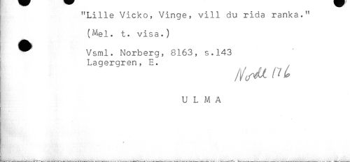 //// "Lille Vicko, Vinge, vill du rida ranka." //// (Mel. t. visa.) //// ^ Vsml. Norberg, 8163, s.143 //// Lagergren, E. //// U L M A //// - //// L ////