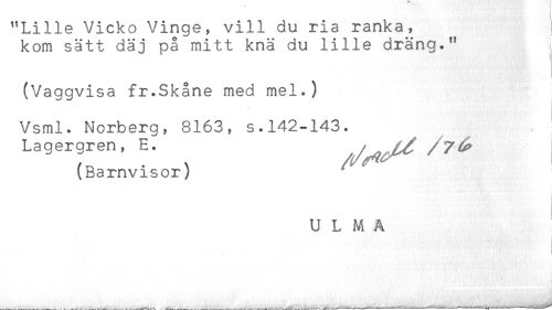 //// "Lille Vicko Vinge, vill du ria ranka, //// kom sätt däj på mitt knä du lille dräng." //// (Vaggvisa fr.Skåne med mel.) //// Vsml. Norberg, 8163, s.142-143. //// Lagergren, E. //// (Barnvisor) //// U L M A //// t //// __^ ^ ^ ^ ^ ^ ^ ^ ////