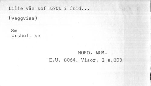 //// Lille vän sof sött i frid... //// (vaggvisa) //// ! //// Sm //// Urshult sn //// i //// * //// NORD. MUS. //// E.U. 8064. Visor. I s.803 //// f ////