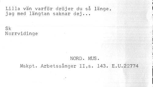 //// Lilla vän varför dröjer du så länge, ^ //// jag med längtan saknar dej... //// Sk //// — //// Norrvidinqe ! //// i //// H //// NORD. MUS. //// Mskpt. Arbetssånger II,s. 143. E.U.22774 E //// ^ C //// . { //// ) ////