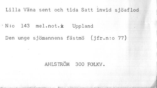 //// Lilla Vana sent och tida Satt invid sjöaflod //// 'N:o 143 mel.not.k Uppland //// Den unge sjömannens fästmö (jfr.n:o 77) //// i //// ,,< , .' t //// AHLSTRÖM 300 FOLKV. ////