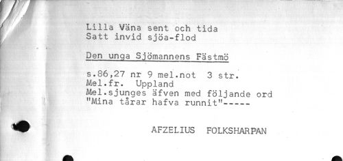 //// ^ Lilla Väna sent och tida //// Satt invid sjöa-flod //// i Den unga Sjömannens Fästmö //// ' s.86,27 nr 9 mel.not 3 str. //// Mel.fr. Uppland //// Mel.sjunges äfven med följande ord //// "Mina tårar hafva runnit"----- //// AFZELIUS FOLKSHARPAN ////