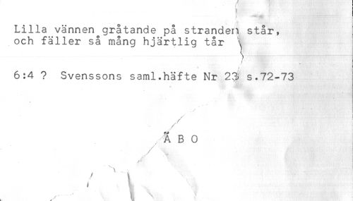 //// . //// Lilla vännen gråtande på stranden står, //// och fäller så mång hjärtlig tår \ //// 6:4 ? Svenssons saml.häfte Nr 23i s.72-73 //// ^. //// - ' '- //// i //// / ' - . 'g ; ^ //// ÅBO //// v .^Hg //// K \ - r;:,.^ //// k V ////