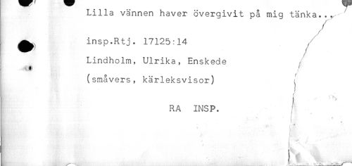 //// Lilla vännen haver övergivit på mig tänka..^ //// //// /^ insp.Rtj. 17125:14 //// Lindholm, Ulrika, Enskede //// (småvers, kärleksvisor) , //// RA INSP. //// * ^ //// . //// K-..:. M //// * L ////