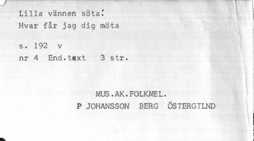//// Lilla vännen sötaf //// o //// Hvar far jag dig möta //// K- //// s. 192 v //// nr 4 End.tsxt 3 str. //// MUS.AK.FOLKMEL. //// P JOHANSSON BERG ÖSTERGTLND ////