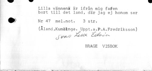 //// Lilla vännenä är ifrån mig fafen //// bort till det land, där jag ej honom ser //// * //// Nr 47 mel.not. 3 str. //// { //// (Åland ,KumMnge. Uppt.a.P.A.Fredriksson) //// t //// BRAGE VISBOK //// t //// i //// * . ////