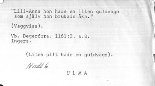 //// "Lill-Anna hon hade en liten guldvagn //// som själv hon brukade åka." % //// (Vaggvisa). //// Vb. Degerfors, 1161:2, s.8. j //// Ingers. ) //// K \ //// (Liten pilt hade en guldvagn). ^ ////