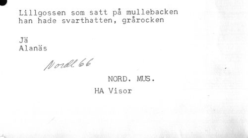 //// Lillgossen som satt på mullebacken //// han hade svarthatten, grårocken //// Jä //// Alanäs //// NORD. MUS. //// HA Visor ////