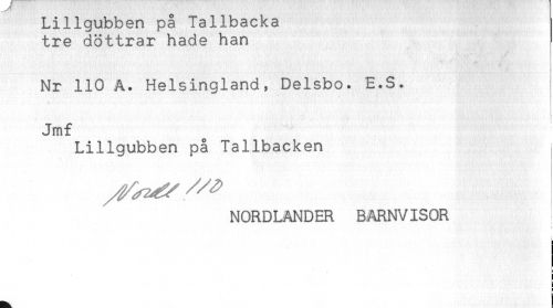 //// Lillgubben pa Tallbacka //// tre döttrar hade han //// Nr 110 A. Helsingland, Delsbo. E.S. //// Jmf //// Lillgubben på Tallbacken //// < //// NORDLANDER BARNVISOR //// ) //// t //// i ////