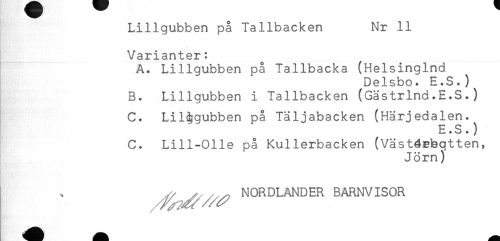//// Lillgubben på Tallbacken Nr 11 //// Varianter: //// A. Lillgubben på Tallbacka (Helsinglnd //// Delsbo. E.S.) //// B. Lillgubben i Tallbacken (Gästrlnd.E.S.) //// C. Lillgubben på Täljabacken (Härjedalen. //// E.S.) //// C. Lill-Olle på Kullerbacken (Västéebqtten, //// Jörn) //// NORDLANDER BARNVISOR ////