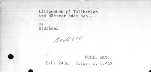 //// !- < ...... //// L,. - //// Lillgubben på Tallbacken //// tre döttrar hdde han... //// Hs //// Bjuråker //// # NORD. MUS. //// E.U. 2438. Visor. 1. s.457 ////