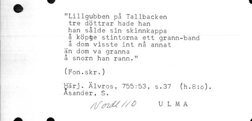 //// "Lillgubben på Tallbacken //// tre döttrar hade han //// han sålde sin skinnkappa //// å köp§e stintoma ett grann-band //// å dom visste int nå annat //// än dom va granna //// å snorn han rann." //// (Fon.skr.) //// Härj. Älvros, 755:53, s.37 (h.8:o). //// Asander, S. ////