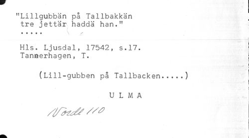 //// * //// "Lillgubbän på Tallbakkän ! //// tre jettär haddä han." //// * * + * + ^ //// ***' * //// } //// Hls. Ljusdal, 17542, s.17. //// Tanaerhagen, T. //// (Lill-gubben på Tallbacken.....) //// U L M A ////