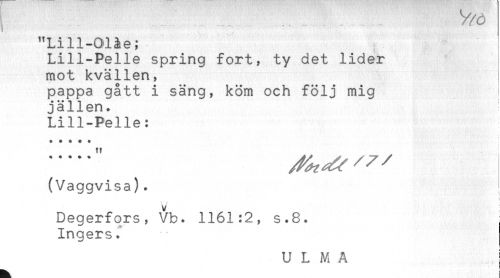 //// .....X/6) //// "Lill-Olåe; //// Lill-Pelle spring fort, ty det lider //// mot kvällen, //// pappa gått i säng, köm och följ mig //// jällen. //// Lill-Pelle: //// ***** //// (Vaggvisa). //// Degerfors, Vb. 1161:2, s.8. //// Ingers. ////