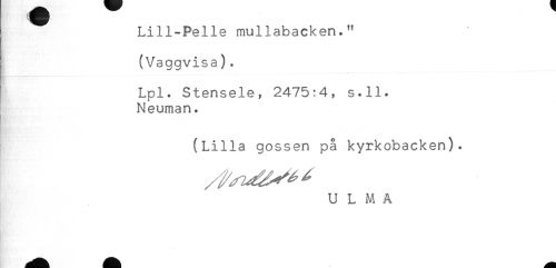 //// Lill-Pelle mullabacken." //// (Vaggvisa). //// Lpl. Stensele, 2475:4, s.ll. //// ^ Neuman. //// (Lilla gossen på kyrkobacken). //// U L M A ////