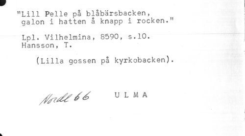 //// "Lill Pelle på blåbärsbacken, ! //// galon i hatten å knapp i rocken." //// Lpl. Vilhelmina, 8590, s.10. //// Hansson, T. //// (Lilla gossen på kyrkobacken). //// u L M A //// i //// ) ////