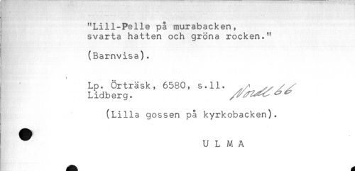 //// * //// * - //// ' "Lill-Pelle på murabacken, //// svarta hatten och gröna rocken." //// (Barnvisa). //// Lp. Örträsk, 6580, s.ll. //// Lidberg. //// (Lilla gossen på kyrkobacken). //// ^ U L M A ////