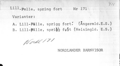 //// Lill-Pelle, spring fort Nr 171 //// Varianter: //// A. Lill-Pälle, sprigg fortf (Ångermld.E.S.) //// B. Lill-pälle, sprigg fp§t (Helsingld. E.S.) //// NORDLANDER BARNVISOR //// H //// IH //// s //// a //// H ////