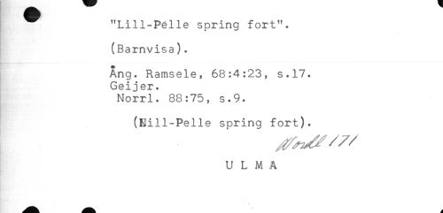 //// "Lill-Pelle spring fort". //// (Barnvisa). //// Ang. Ramsele, 68:4:23, s.17. //// Geijer. //// Norrl. 88:75, s.9. //// (Hill-Pelle spring fort). //// U L M A ////