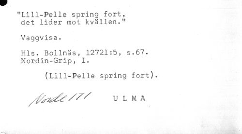 //// "Lill-Pelle spring fort, //// det lider mot kvällen." //// Vaggvisa. //// Hls. Bollnäs, 12721:5, s.67. //// Nordin-Grip, 1. //// (Lill-Pelle spring fort). //// ^ ^ U L M A ////