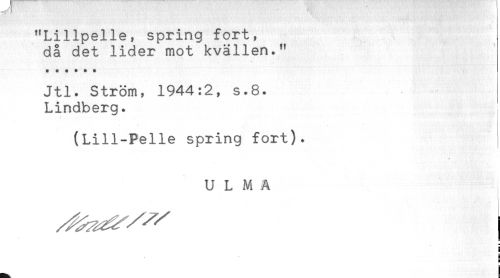 //// "Lillpelle, spring fort, //// då det lider mot kvällen." //// Jtl. Ström, 1944:2, s.8. //// Lindberg. //// (Lill-Pelle spring fort). //// * //// U L M A //// I //// * //// H //// < //// i //// H ////
