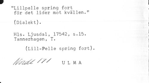 //// "Lillpelle spring fort //// för det lider mot kvällen." //// (Dialekt). I //// i //// i //// Hls. Ljusdal, 17542, s.15. ; //// Tannerhagen, T. //// (Lill-Pelle spring fort). //// ^^ U L M A ////