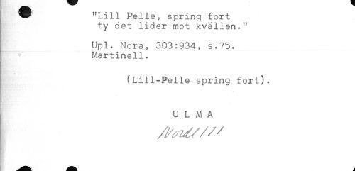 //// V "Lill Pelle, spring fort //// ty det lider mot kvällen." //// Upl. Nora, 303:934, s.75. //// Martinell. //// (Lill-Pelle spring fort). //// U L M A ////