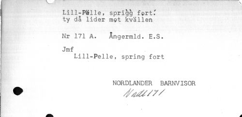 //// ! Lill-Pälle, sprigg f^rt^ //// ty då lider mpt kvällen //// I Nr 171 A. Ångermld. E.S. //// [ Jmf //// Lill-Pelle, spring fort //// NORDLANDER BARNVISOR //// ! ////