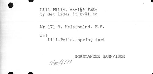 //// Lill-Pälle, sprigg fpSt //// ty det lider åt kvällen //// Nr 171 B. Helsinglnd. E.S. //// Jmf //// Lill-Pelle, spring fort //// NORDLANDER BARNVISOR ////