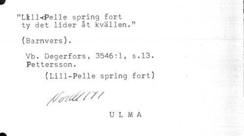 //// "LMl-fPelle spring fort //// ty det lider åt kvällen." //// (Barnvers). //// ; //// Vb. Degerfors, 3546:1, s.13. ; //// Pettersson. //// . < //// i //// (Lill-Pelle spring fort) //// U L M A ////