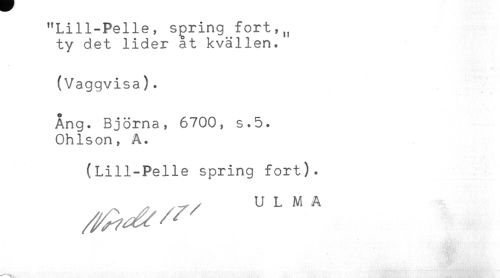 //// "Lill-Pelle, spring fort,,, //// ty det lider at kvällen. //// (Vaggvisa). //// o //// Ang. Björna, 6700, s.5. //// Ohlson, A. //// (Lill-Pelle spring fort). //// ^ ^ , ULM A ////