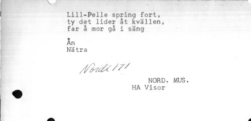 //// Lill-Pelle spring fort, //// ty det lider åt kvällen, //// far å mor gå i säng //// * //// An //// Nätra //// ] NORD. MUS. //// { ^ HA Visor ////