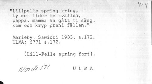 //// ( //// "Lillpelle spring kring, //// ty det lider te kvällen, //// pappa, mamma ha gått ti säng, //// kom och kryp preni fällen." //// Marieby, Sawicbi 1933, s.172. //// ULm: 6771 s.172. //// (Lill-Pelle spring fort). //// ^^ U L M A //// ! //// ) ////