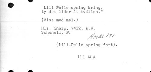 //// ^^ "Lill Pelle spring kring, //// ty det lider åt kvällen." //// (Visa med mel.) //// ; Hls. Gnarp, 7422, s.9. //// Schenell, P. //// (Lill-Pelle spring fort). //// U L M A //// * - ////