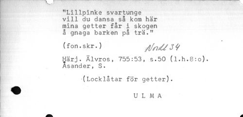 //// ! "Lillpinke svartunge //// vill du dansa så kom här //// mina getter får i skogen //// å gnaga barken på trä." //// * //// (fon.skr.) //// ^ärj. Älvros, 755:53, s.50 (l.h.8:o). //// Asander, S. //// (Locklåtar för getter). //// ^ U L M A ////