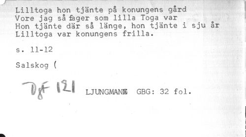 //// Lilltoga hon tjänte pä konungens gara //// Vore jag så ifager som lilla Toga var //// Hon tjänte där så länge, hon tjänte i sju år //// Lilltoga var konungens frilla. //// . //// i //// s. 11-12 //// Salskog ( //// t LJUNGMAN8 GBG: 32 fol. //// ' //// I ////