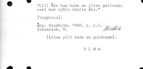 //// * "Lill Ake han hade en liten gullvagn, //// ' vari han själv skulle åka." //// (Vaggvisa). //// Ang. Bjurholm, 7450, c, s.1. //// //Johansson, H. //// ! (Liten pilt hade en guldvagn). //// U L M A ////