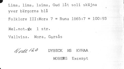 //// Lima, lima, laima, Gud lat soli skajna //// % //// yver bärgorna blå //// Folklore III:Mora 7 = Runa 1865:7 = 100:93 I //// Mel.not.^x 1 str. //// * //// Vallvisa. Mora, Garsås //// ) //// ^ DYBECK MS KVHAA //// MOBERG Excerpt ////