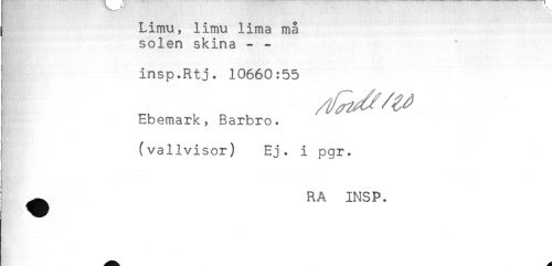 //// Limu, limu lima må //// solen skina - - //// . //// insp.Rtj. 10660:55 //// Ebemark, Barbro, //// (vallvisor) Ej. i pgr. //// ^ RA INSP. //// < ////