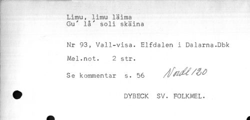 //// - - . ; //// Limu, limu läima //// Gu' lå' soli skäina //// .. //// Nr 93, Vall-visa. Elfdalen i Dalarna.Dbk //// Mel.not. 2 str. //// Se kommentar s. 56 //// ^ DYBECK SV. FOLKMEL. ////