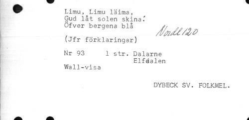 //// ^^ Limu, Limu läima, //// Gud låt solen skina' //// Ofv.r ber^na blå //// (Jfr förklaringar) //// * //// Nr 93 1 str. Dalame //// Elfdalen //// Wall-visa //// DYBECK SV. FOLKMEL. ////